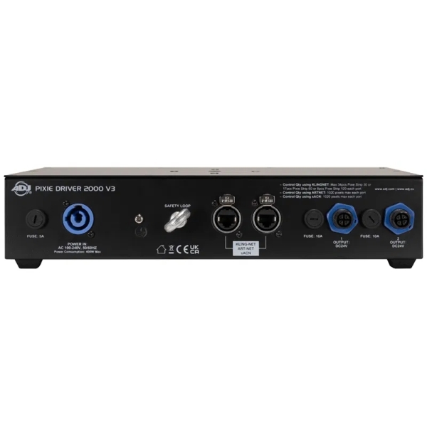 The ADJ Pixie Driver 2000 V3 is designed specifically for the ADJ's Pixie Strip 30, Pixie Strip 60, Pixie Strip 120 and Pixie Curve 60. It provides easy and versatile control options including simple on-board manual dimming and strobe control, plus full pixel mapping control of 2,040 max pixels via Kling-Net, Art-Net or sACN (streaming ACN) protocols.