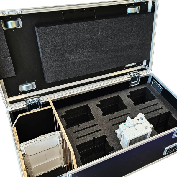 These flight cases consist of 10mm plywood with an HPL top layer and feature Penn Elcom heavy duty insert profiles, hinges, handles and automatic locks.