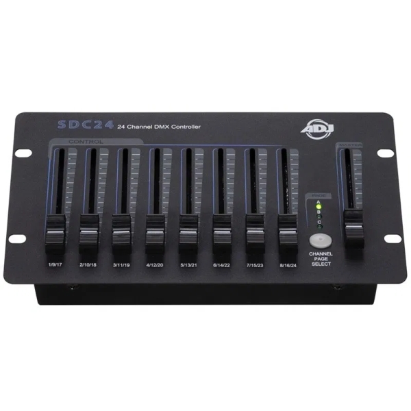 The ADJ SDC24 DMX Controller is a basic 24-channel DMX Controller that operates via an external 12VDC power supply (included) or a 9VDC battery (not included). SDC24 has 5-pin and 3-pin DMX output sockets, DIP switches to set a starting DMX channel, a master dimmer fader, an on/off switch and Channel Page button with Indicator LEDs. This a great compact controller for product demos or manual control of LED or conventional fixtures.