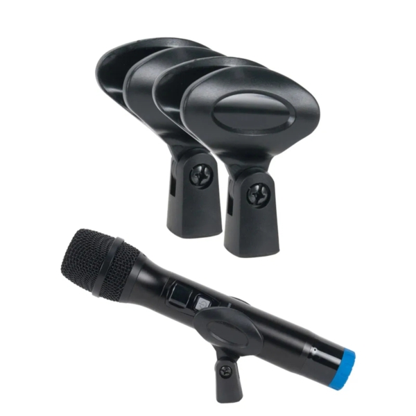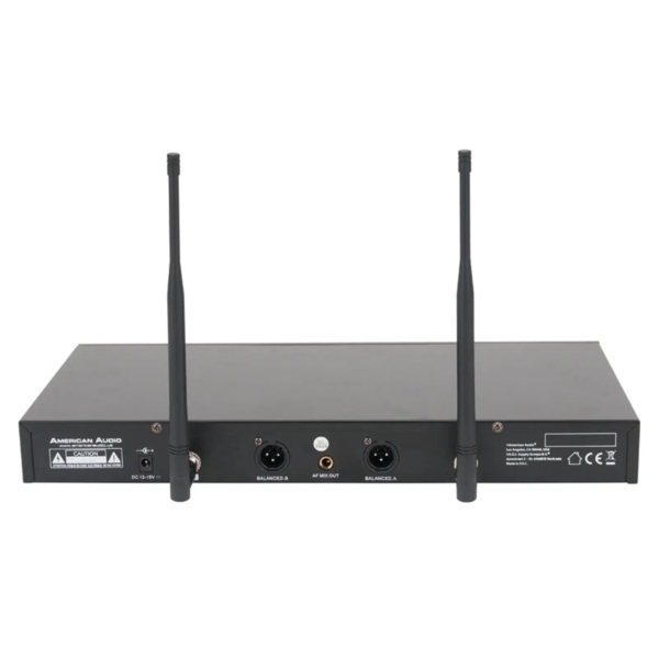 The American Audio WM-219 Dual Radio Microphone System is a 2-channel UHF wireless microphone system that includes two wireless microphones, two different colour coded rings (to differentiate each microphone) and a wireless receiver with individual volume control and audio input for each microphone.