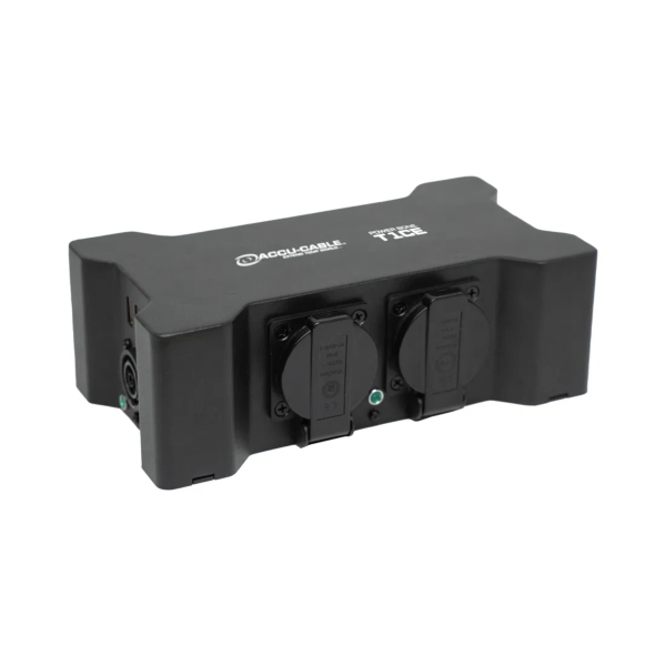 The Accu-Cable Power Bone: T1CE PowerCON to Schuko Power Distribution Box is designed to provide reliable and secure power distribution event productions and permanent installations. With its innovative features, the Power Bone T1CE ensures convenient power connectivity.