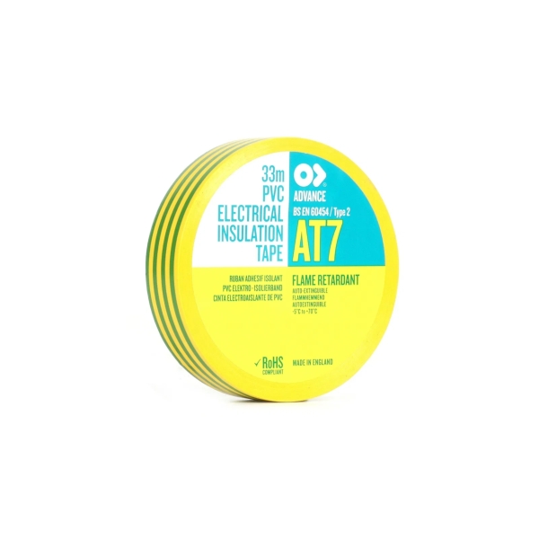 Advance AT7 PVC Electrical Insulation Tape, 19mm x 33m - Yellow/Green (Pack of 10)
