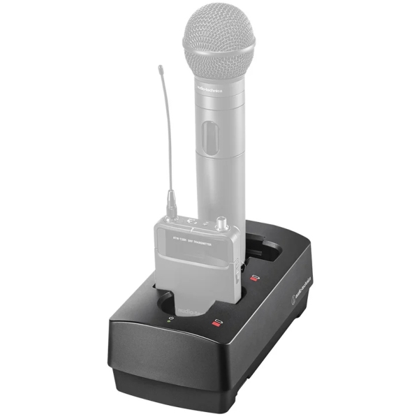 The Audio-Technica ATW-CHG3Na is a networked two-bay charging station for use with 3000 Series transmitters, 3000 Series IEM receiver, and System 20 PRO transmitters. The station charges NiMH batteries (not included) while they are housed within a transmitter. It will automatically shut off if alkaline or damaged batteries are detected. Once fully charged, a maintenance charging function ensures that batteries retain their full power for as long as the transmitter remains in the charging station.