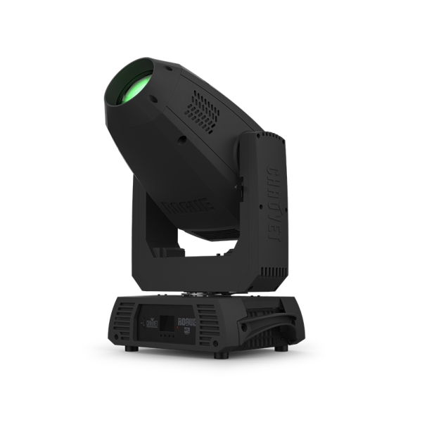 The Chauvet Pro Rogue R3E Spot features an expansive 8.4° to 42.8° zoom in a compact, lightweight moving yoke spot. Its intensely bright 350W LED light engine combines high output with a full effects arsenal: dual gobo wheels (one rotating with interchangeable gobos + one static) for creating custom gobo morphing looks; dual color wheels each with eight brilliant colors + white + split colors; 3-facet rotating prism for stunning aerial effects; and motorized iris and frost for beam shaping. Selectable LED max output settings enable matching brightness with legacy Rogue movers in your rig.