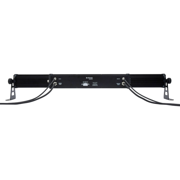 The Citronic Aqua-Bar Waterproof RGBWA/UV LED Wall Bar combines premium quality components with a heavy-duty waterproof housing to offer the ultimate outdoor wall wash solution. 18 high output RGBWA/UV LEDs can be controlled automatically from preset internal colour sequences, alternatively the bar can be operated remotely by DMX in either 6, 8, 9 or 12 channel modes if more precise control is required. Supplied with extendable waterproof connections and tilt-adjustable brackets for mounting to walls or ceilings.