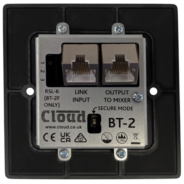 The Cloud BT-2EB Bluetooth Wireless Audio Module is a wall-mounting remote input module for use with Cloud DCM1 Series products fitted with an RJ45 Extension Port. The BT-2 enables compatible portable devices such as laptops, tablets and smartphones to stream audio wirelessly into the installed zone.