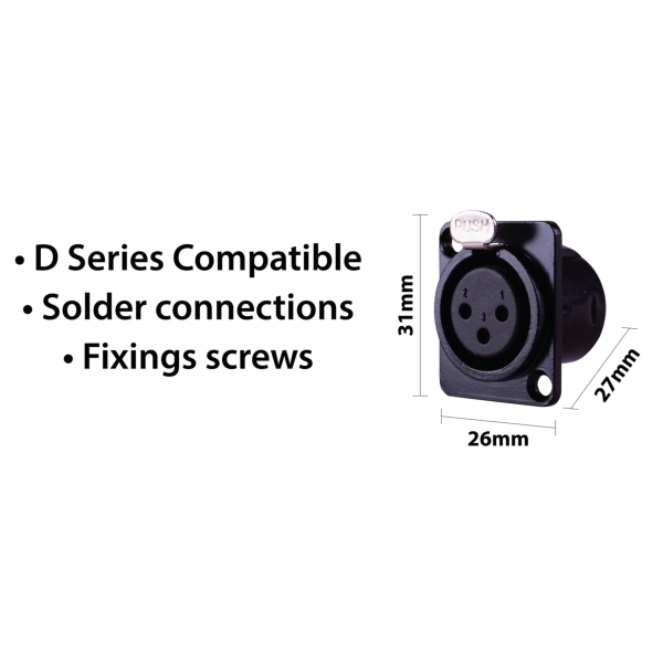 Eagle D-Series Metal 3-Pin Female XLR Connector Plate Specifications- Colour: Black- Product Dimensions (mm): 31 x 26 x 27- Net weight (kg): 0.02