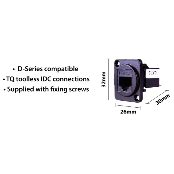 Eagle D-Series Metal CAT6 Ethernet Toolless IDC Connector Plate Specifications- Colour: Black- Product Dimensions (mm): 31 x 26 x 30- Net weight (kg): 0.02