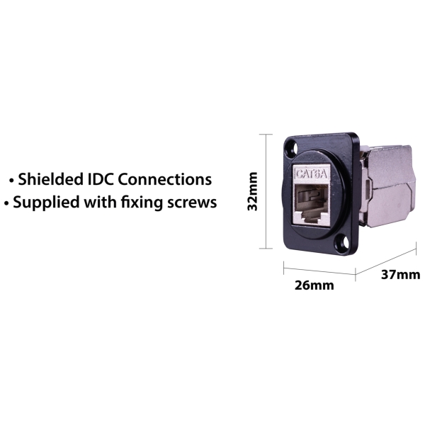 Eagle D-Series Metal CAT6a Shielded Ethernet IDC Connector Plate Specifications- Colour: Black- Product Dimensions (mm): 32 x 26 x 37- Net weight (kg): 0.02