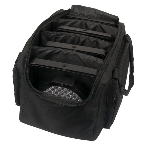 The Eliminator F4 Flat Par Bag is a durable padded transport bag designed for modern Flat PAR fixtures. Holding up to four slim LED PAR cans, it offers a lightweight and convenient alternative to bulky flight cases. The soft case folds flat for easy storage and is made from tough, dirt-repellent synthetic material in black finish. Removable padded dividers let you adapt the bag for different equipment, while front accessory pockets provide space for cables, clamps, or controllers. Perfect for DJs, bands, and mobile entertainers, the Eliminator F4 PAR BAG EP makes transporting and storing lighting fixtures simple and efficient.