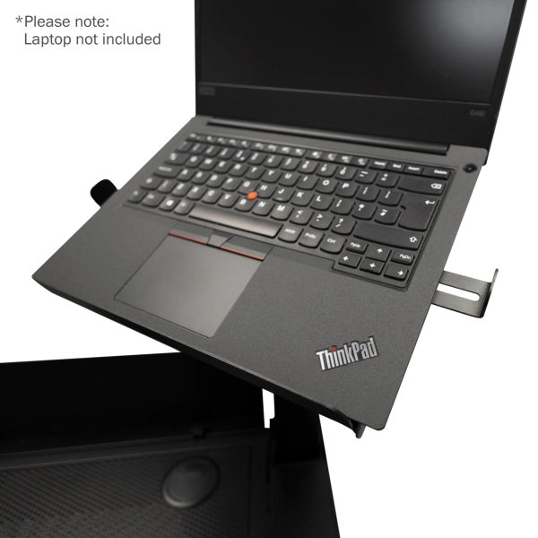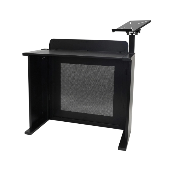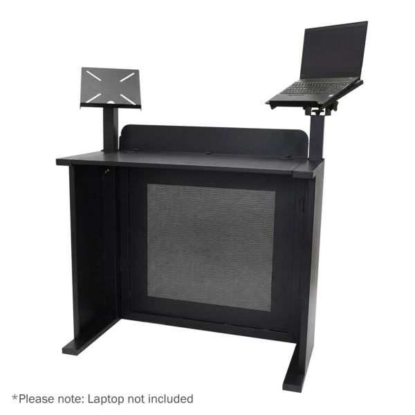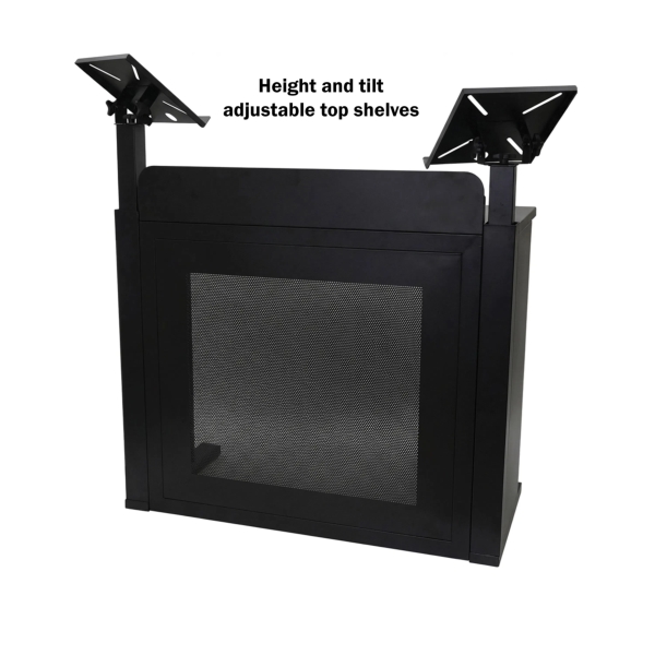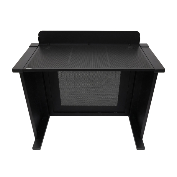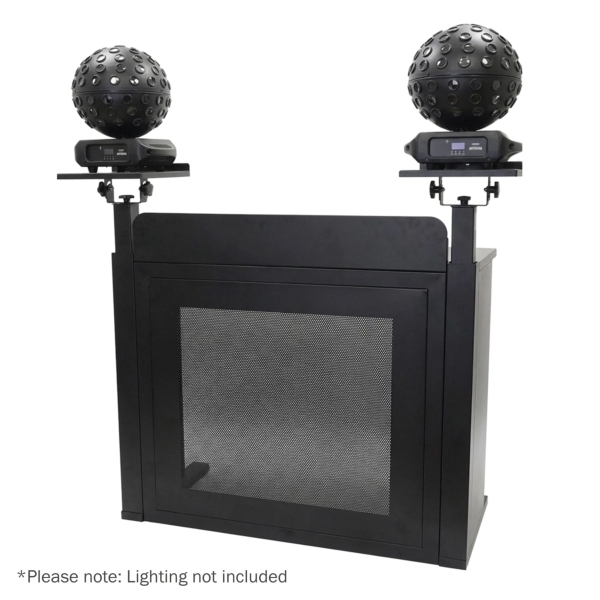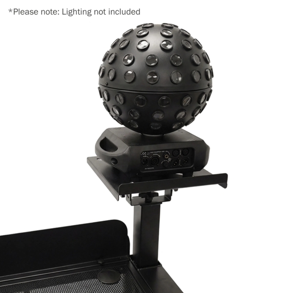 Two fully height and tilt adjustable shelves provide a two-tier system allowing CDJ's, laptops or moving heads to be facilitated over the main deck which in turn can easily hold most mixers and controllers etc, this ensures that all equipment is within easy reach. Pre-drilled holes allow for the fixing of moving heads etc and convenient and tidy cable routing.