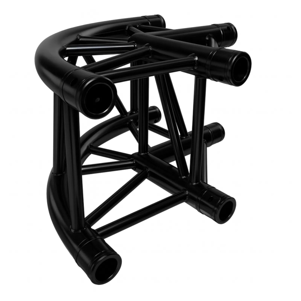 The Global Truss F34 Standard 2 Way 90 Degree Corner Round is a versatile 4-point system with an external dimension of 29cm. With its excellent load capacity relative to weight and size, the F34 system is widely used for stage, exhibition, and event structures. The 2-way C21 corner with 90° rounded edges allows right-angle connections with a smoother finish, ideal for clean stage designs and exhibition booths. Constructed from 50x2mm main tubes and 20x2mm diagonal braces of aluminium, each corner is supplied with conical connectors for secure assembly. This black powder-coated version provides a professional finish suitable for stage and event environments. Please note this corner is not TÜV certified.