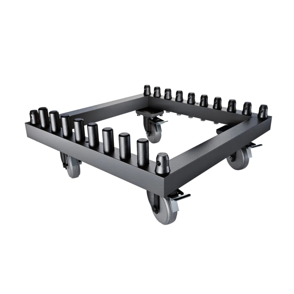 The Global Truss F31PL Modular U Frame Dolly is a heavy-duty transport dolly designed to carry up to 10 x 500mm U Frames. Finished in Stage Black, it provides a practical and reliable solution for safely moving and storing U Frames. Constructed from robust, lightweight aluminium, the dolly ensures durability on the road and in venues, while the fitted castors allow smooth handling across multiple surfaces. Its compact footprint and reinforced structure make it ideal for touring, rental, and event production companies that need quick and efficient handling. The dolly's lid is made of durable multiplex wood and serves not only as protection but also as an additional, stable surface for transporting other equipment or smaller stage elements. Furthermore, there are two pre-drilled holes in the centre of the dolly. These allow for the mounting of one conical each, enabling a single U Frame to be fixed in the centre of the dolly. This means the dolly base can be used not only for transport but also as a mobile stage element, flexibly integrated into the stage design.