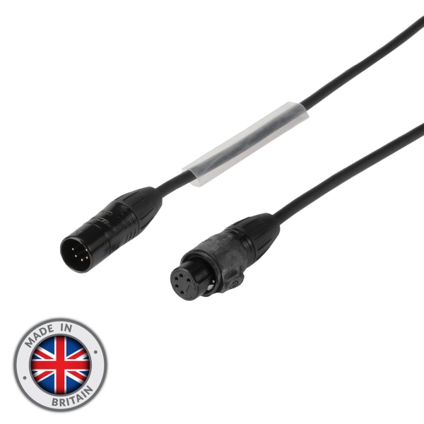 The elumen8 Seetronic Male to Female 5-Pin IP XLR Cable is a high quality cables made in Britain using genuine Seetronic black body IP65 XLR connectors and Elumen8 tour grade 1 pair screened DMX cable. Designed to carry digital signals from between consoles and fixtures. A super flexible and durable PVC jacket protects the inner workings of the cable from harsh environments. In addition, the inner cores feature heat resistant insulation to protect the integrity of the signal even when subjected to high temperatures.