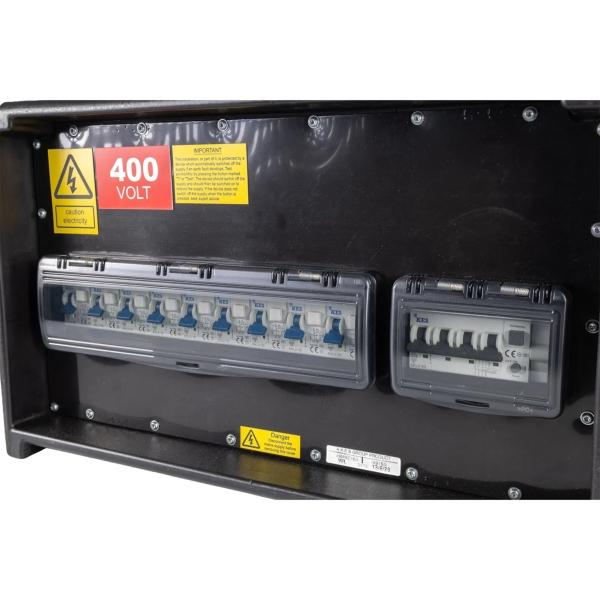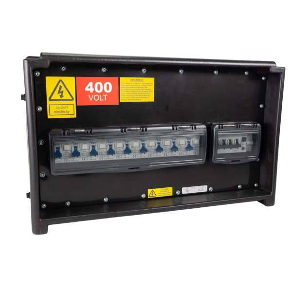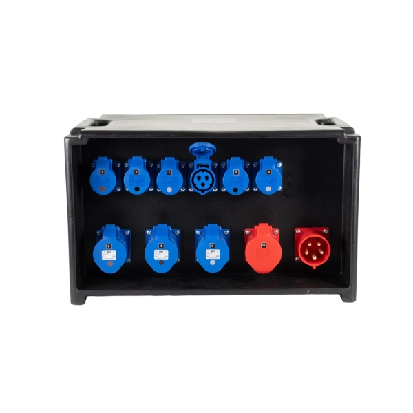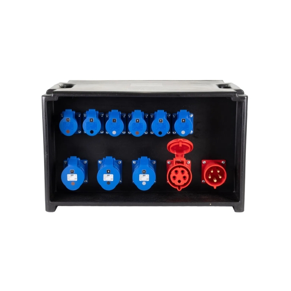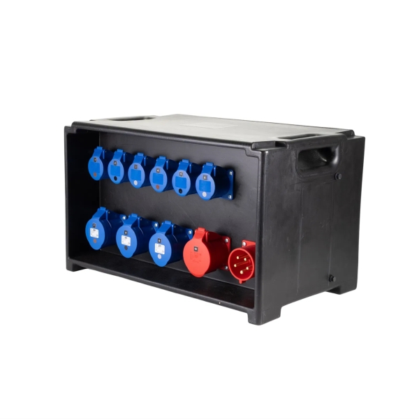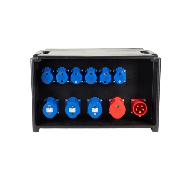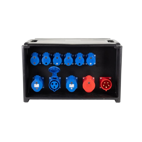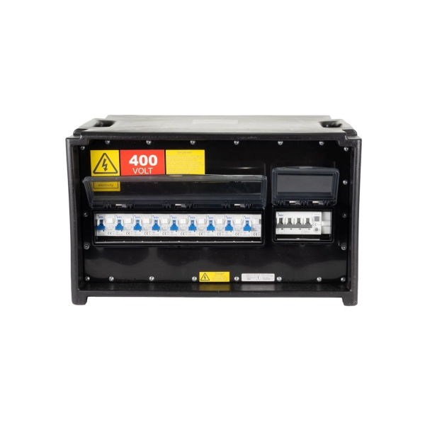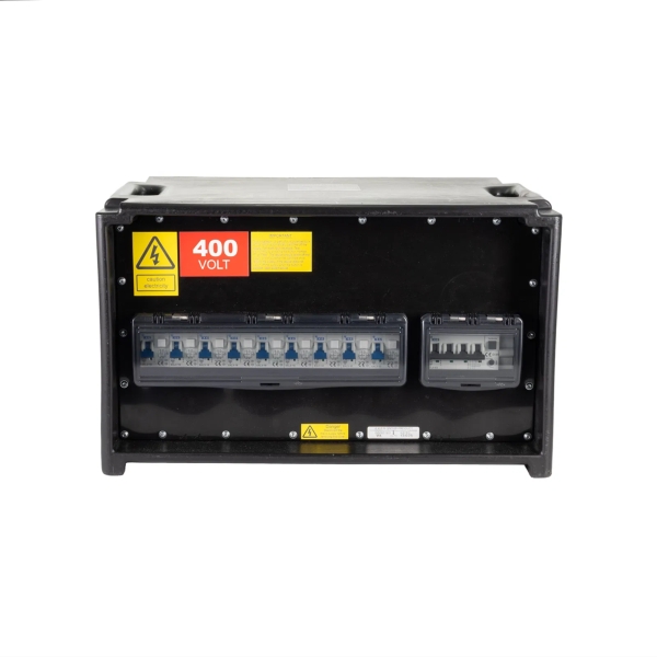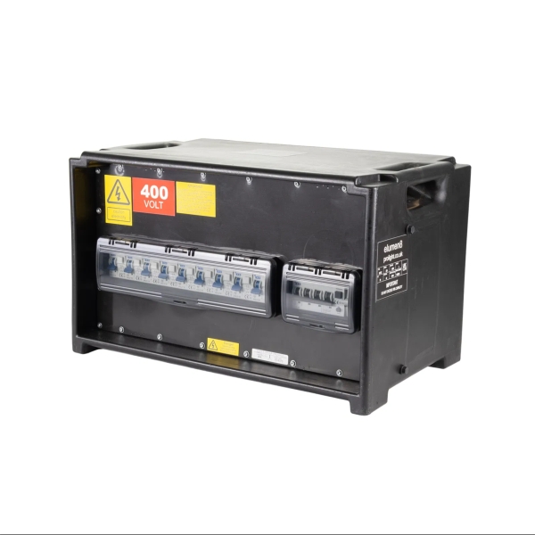The elumen8 MERZ Distribution Box 32A 3PH to 32A/16A RCBO is robust, lightweight, and made of shock-resistant thermoplastic. Designed for demanding rental and event use, they are IP44 splash-proof rated and feature a stackable design for space-saving storage. Built in Britain, these handy distribution boxes combine durability with safety, making them ideal for temporary power applications.