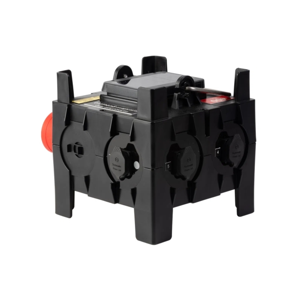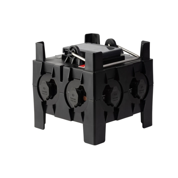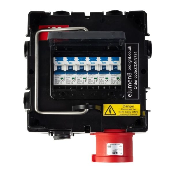 The PCE IMST Distribution Box 32A 415V In, 6x TR1 IP65 Out is a variant of the CONN48 power distribution box, fitted with six Seetronic Powertwist TR1 IP65-rated outlets for enhanced weather protection. Designed for professional event and touring environments, it features a 32A 415V~50/60Hz 5-pin 3P+N+E IP44-rated inlet feeding six Seetronic PowerTwist TR1 each protected by a 16A 30mA 2P C curve, type A RCBO. Compact yet durable, the CONN731 offers reliable power distribution for lighting and audio setups, with robust construction suited to demanding environments.