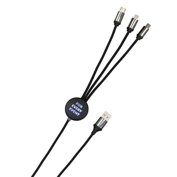Prolight USB Charge Cable Features- Dual input with both USB-A and USB-C connectors- Three way output offering Micro-USB, USB-C and lightning connectors- Nylon braided finish- Moulded connectors- Illuminated PROLIGHT logo- Overall length: 1.2m