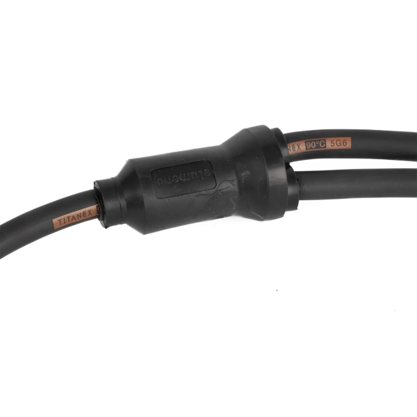 The elumen8 Moulded Y Split is a 32A 415V three phase two-way splitter, injection moulded for maximum durability. Manufactured in Britain using Titanex H07RN-F 6mm² five core tough rubber cable, it features one input and two outputs with 1.5m bare-end tails. The rugged moulded joint is IP65 rated, making it suitable for demanding stage, touring, and industrial power distribution applications.