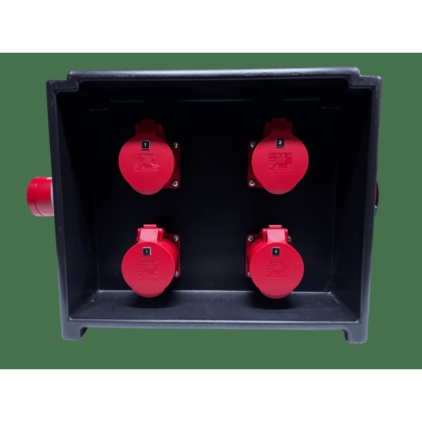 KES MERZ Distribution Box 63A 400V to 4x 32A 400V Specifications - Brand: KES - Current Rating: 63A - Voltage Rating: 400V - Input Voltage Rating: 400V - Output Voltage Rating: 400V - Incoming Parameters / Supply Arrangement: 63A 400V 3P+N+E appliance inlet - Outgoing Circuits: 4no 32A 400V 3P+N+E sockets - Colour: Black