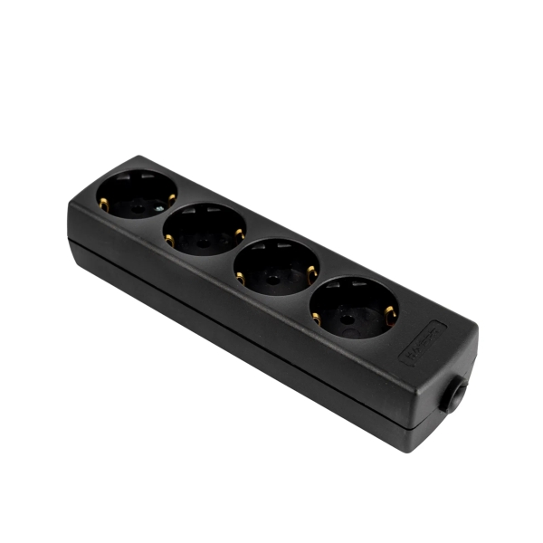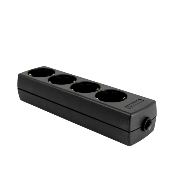 The Kaiser 4-Gang Schuko Socket with earth ground connection. Each outlet is positioned at a 45° angle for ease of use. The unit's housing is rectangular in shape with a matte surface finish, offering a rugged and reliable solution for stage, event, and commercial power distribution.