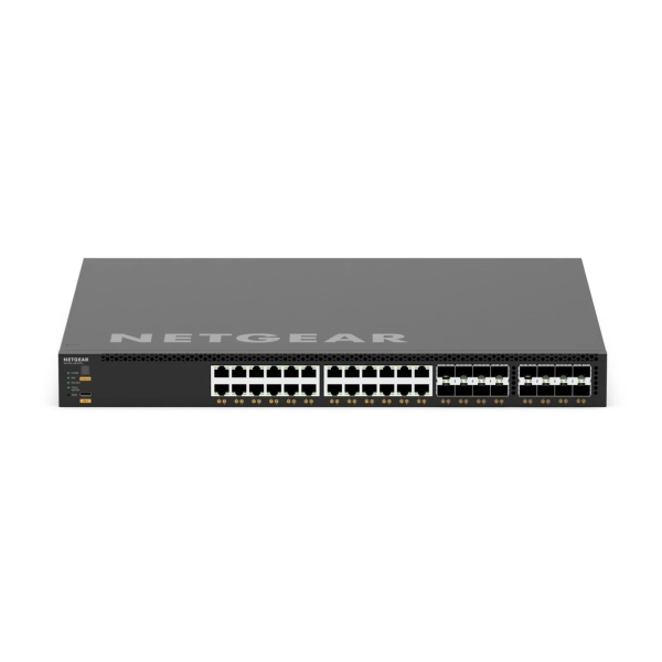 The Netgear XSM4340V-100NES is a fully managed AV and IT edge-to-core switch with 24 10G/Multi-Gig PoE++ ports, 8 10G SFP+ ports and 8 25G SFP28 ports, offering flexible high-speed connectivity in a 1U rackmount form factor. It provides a PoE++ budget of 290W base, expandable up to 1,770W, and includes enhanced multicast support suitable for AV-over-IP deployments. The switch delivers advanced Layer 3 features and stackable deployment for resilient network architectures.