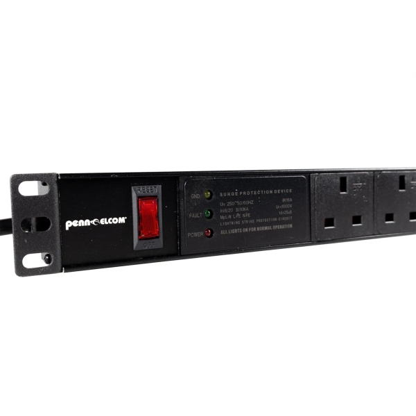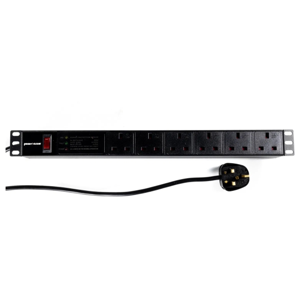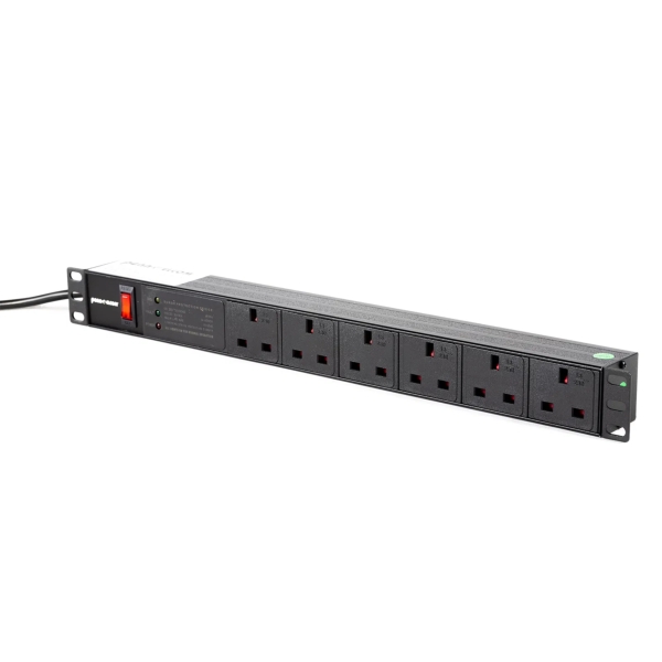 The Penn Elcom PDU6-UK 6-Way UK Plug Horizontal Rack Mount PDU is a 6-way UK plug horizontal rack mount PDU designed for reliable AC power distribution in multimedia rack applications. Featuring surge and lightning strike protection with a resettable 13A over-current trip, it offers safe and versatile power hook-up. The unit includes six shuttered BS1363A Type G outlets, a 13A UK plug input on a 1m lead, and a ground fault indicator. An M3 earth terminal is provided on the rear for rack grounding.