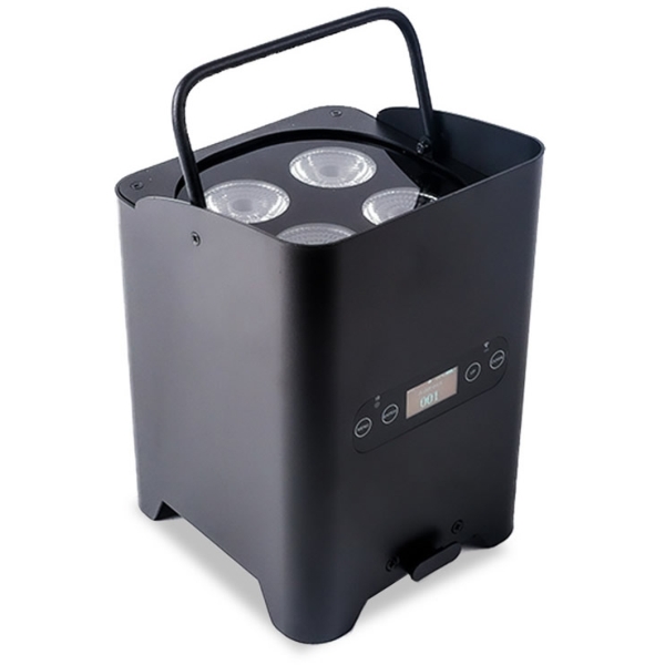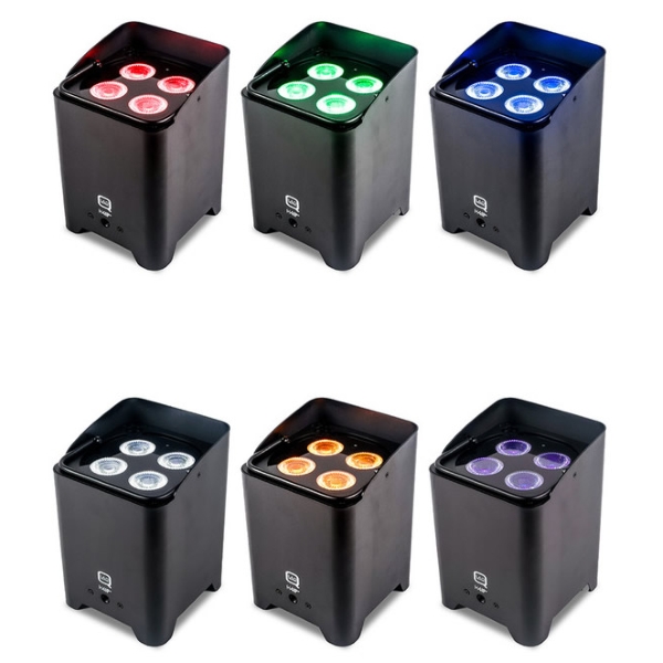 The Q-Audio Q-LED Lighting Flux H4IP+ Battery Powered RGBAW+UV LED Uplighter is a sleek, battery-powered uplighter featuring 4x 12W RGBWAUV LEDs for smooth colour mixing, built-in W-DMX compatibility, and an IP65 rating on the top of the fixture (IP54 underneath) for reliable use both indoors and outdoors.