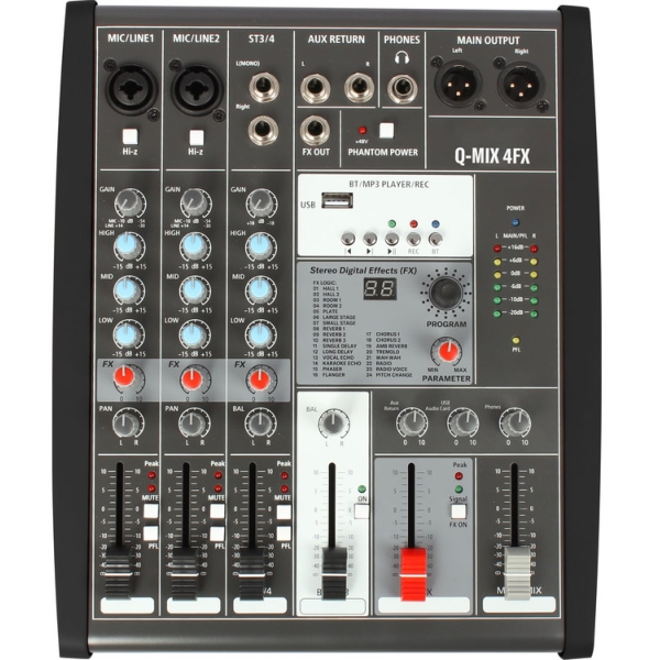 The Q-Audio Q-MIX 4FX 4-Channel Mixer with FX and USB is a compact 4-channel mixer designed for streaming, recording, live sound and entertainment on the move. It features 2 mic inputs with +48V phantom power, 1 stereo input and an independent 3-band EQ on each channel. Integrated MP3/USB/Bluetooth playback and direct recording to a USB makes music and content creation simple.