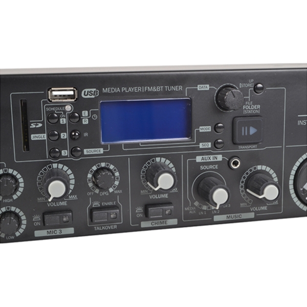 The internal media player supports a FM tuner, Bluetooth receiver, USB thumb drives and SD cards up to 16GB/2000 songs, with MP3 file name display on a large LCD screen. It offers regular and random play modes, elapsed/remaining time display, and an FM tuner with RDS station information. The jingle player is an additional bonus feature for playing announcements and advertising, up to 3 jingles can be played. The jingles can be scheduled or played back via the pressing 1 of 3 switches on the front panel.
