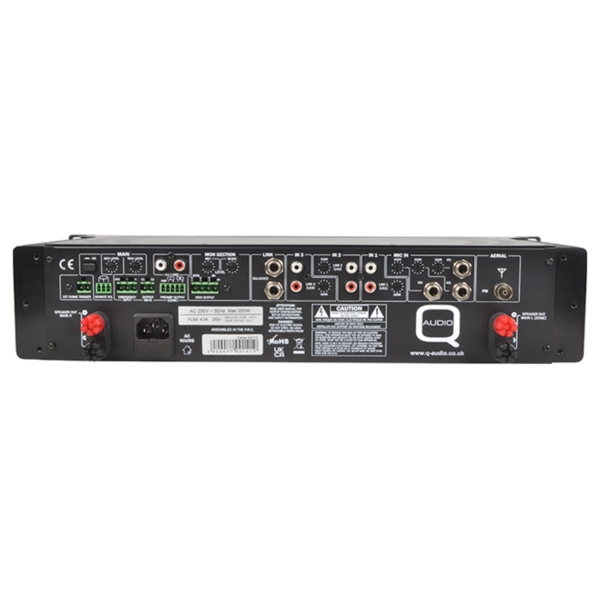 The Q-Audio QAMP3204 One or Two Zone Mixer / Amplifier with Media Player, Bluetooth, FM Tuner, Built-in Jingle Player is a high-performance media amplifier designed for professional audio environments, combining an MP3 player, FM tuner, and versatile microphone inputs with robust stereo power amplification in a compact unit.