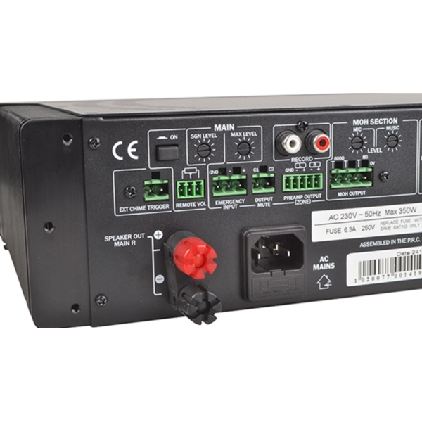Microphone inputs are equipped with phantom power, isolation transformer (Mic 1 only), LPF & Gain controls at the rear, and volume and EQ controls at the front, along with an on/off switch. An adjustable auto talk-over function ensures automatic reduction of music levels during announcements.