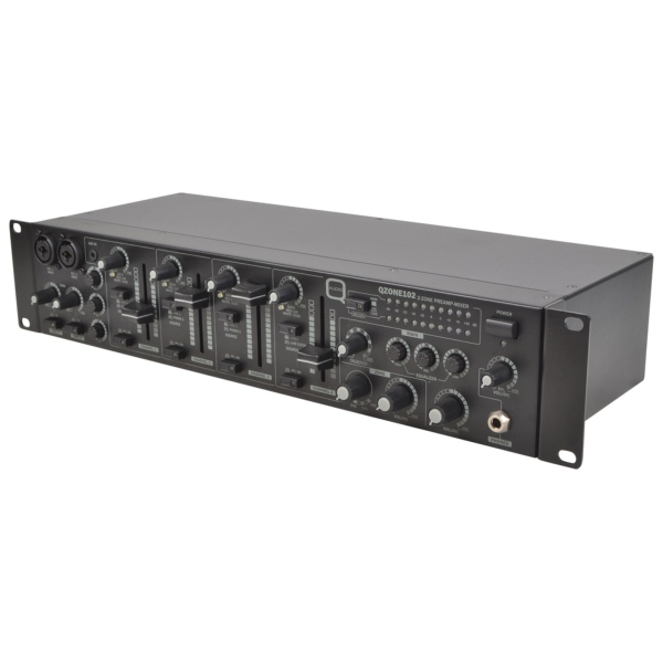 The Q-Audio QZONE102 Zone Mixer 4 Dual Stereo Channels + 2 Microphone Channel with Talk Over into 2 Output Zones allows control of both FOH and background music via 2 zoned output controls.