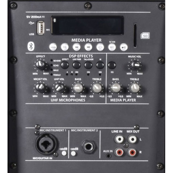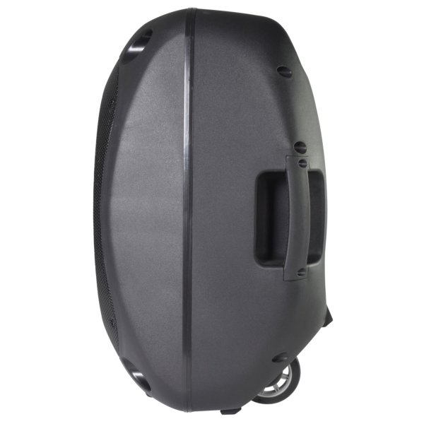 The QTX QOVA-12PA Performance Portable PA Unit is a self-contained PA system designed to offer advanced features for vocalists and performers. Formed into a ported ovoid-shaped cabinet, designed for optimal acoustic delivery, with an inbuilt trolley assembly and handles for easy portability and a 35mm socket for mounting onto a speaker stand if required. Full-range output from a low frequency main driver and Titanium tweeter is driven by a class-D bi-amplifier with active crossover. A dual UHF handheld microphone system is included, and 2 additional wired inputs can accept mic, line or instrument inputs, all via a 2-band EQ for tone adjustment. These inputs can also be processed by the DSP section for digital reverb, delay and special effects. The media player module can play back mp3 files from USB/SD media or stream music via Bluetooth link to a smart phone or even tune in FM radio stations, with Bass, Treble and selectable preset EQ profiles for music playback. Powered from the internal battery or mains supply, the QOVA PA unit lets you take your performance anywhere with all the tools you need for a professional delivery.