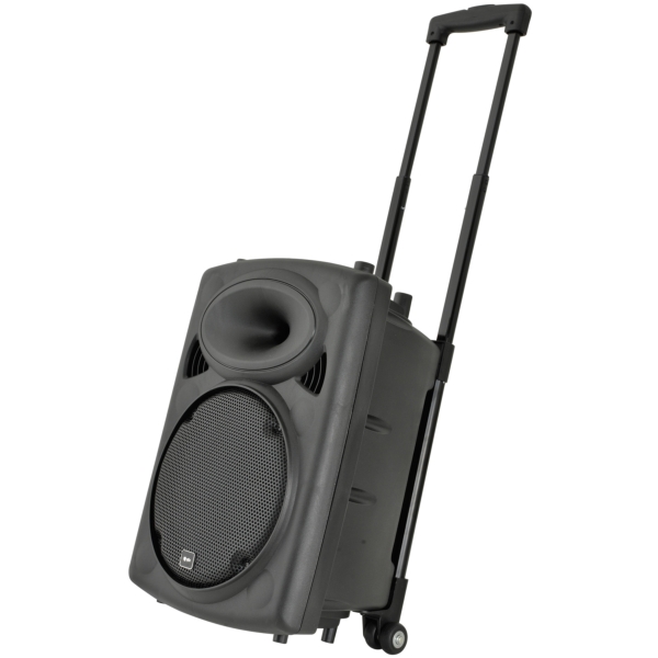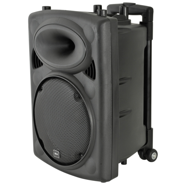 The QTX QR10PA Portable PA Speakers with TWS + UHF Microphone operates from mains or internal rechargeable battery powering a main driver and compression driven horn unit. One or Two handheld UHF wireless microphones are included with the receiver built into the mixer/amp section at the rear along with a further two wired mic inputs, auxiliary line input and integral USB/SD/FM media player with record function. A Bluetooth receiver is also built into the media player to enable pairing with a smartphone or tablet for wireless audio playback with TWS pairing to link 2 QRPA units as a BT stereo pair. A retractable trolley handle and rear wheels provide easy portability.