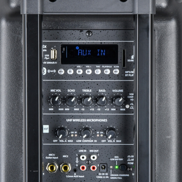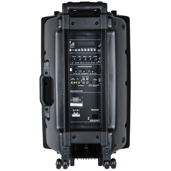 The QTX QR15PA Portable PA Speaker with TWS + UHF Microphone operates from mains or internal rechargeable battery powering a main driver and compression driven horn unit. One or Two handheld UHF wireless microphones are included with the receiver built into the mixer/amp section at the rear along with a further two wired mic inputs, auxiliary line input and integral USB/SD/FM media player with record function. A Bluetooth receiver is also built into the media player to enable pairing with a smartphone or tablet for wireless audio playback with TWS pairing to link 2 QRPA units as a BT stereo pair. A retractable trolley handle and rear wheels provide easy portability.