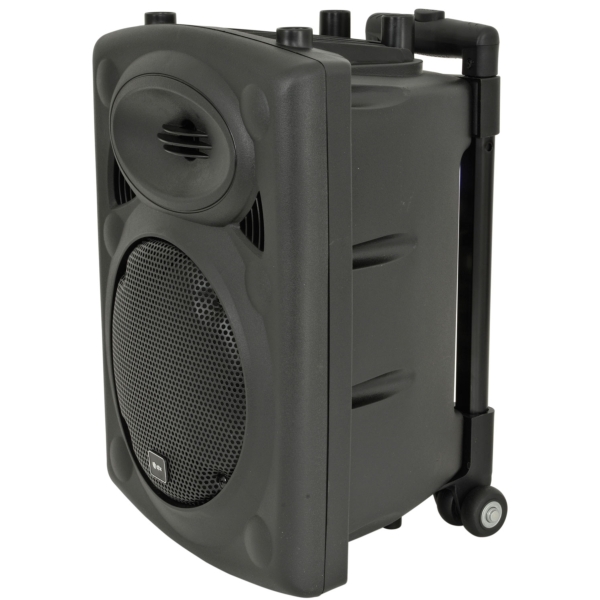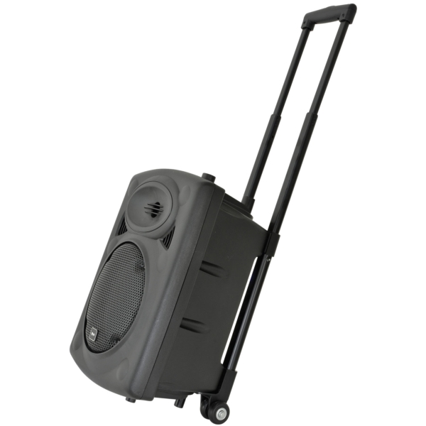 The QTX QR8PA Portable PA Speakers with TWS + UHF Microphone operates from mains or internal rechargeable battery powering a main driver and compression driven horn unit. One or Two handheld UHF wireless microphones are included with the receiver built into the mixer/amp section at the rear along with a further two wired mic inputs, auxiliary line input and integral USB/SD/FM media player with record function. A Bluetooth receiver is also built into the media player to enable pairing with a smartphone or tablet for wireless audio playback with TWS pairing to link 2 QRPA units as a BT stereo pair. A retractable trolley handle and rear wheels provide easy portability.