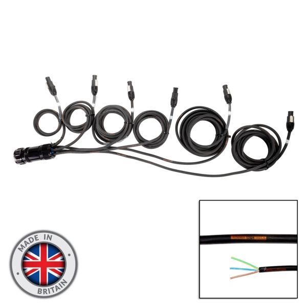 The elumen8 Socapex 19-Pin Male - PowerCON True1 1.5mm Staggered Fan-Out Cable is a high quality, rental-ready Socapex fan out cable made in Britain from Titanex H07RN-F cable and Elumen8 Showsafe 19-Pin UL certified Socapex connectors. The cables are finished with a short length of clear heatshrink ready for identification or asset label, and each tail is numbered to aid circuit identification