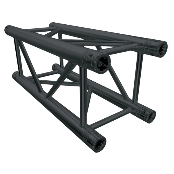 The Global Truss F34 Standard 0.71 Metre Truss is a TÜV approved 4-point system with an external dimension of 29cm. With its excellent load capacity relative to weight and size, the F34 system is one of the most widely used in the industry. From exhibition stands and shop fittings to stage roofs and outdoor structures, F34 truss offers versatility and strength. Constructed from 50x2mm main tubes and 20x2mm diagonal braces of aluminium, each section is supplied with conical connectors for secure assembly. This black powder-coated version provides a professional finish suitable for stage and event environments. The system can also be powder coated in any RAL colour on request.