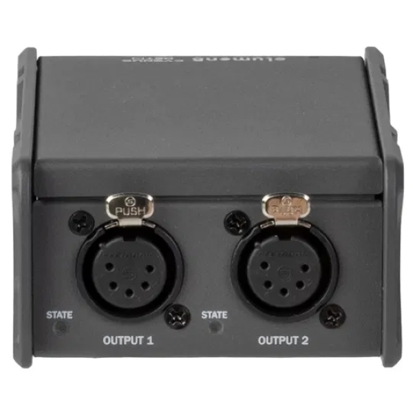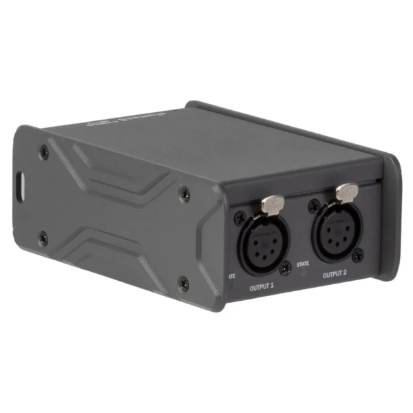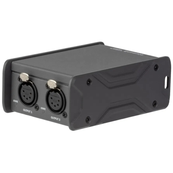 The NET2 is an compact 2-way universe node which converts Art-Net or sACN to DMX giving a maximum of 1024 channels. The POE input allows for a single cable to be used for both power and data. An easy-to-use GUI allows remote access via a computer or over a network. All DMX inputs and outputs are equipped with 5-Pin XLR Seetronic connectors.