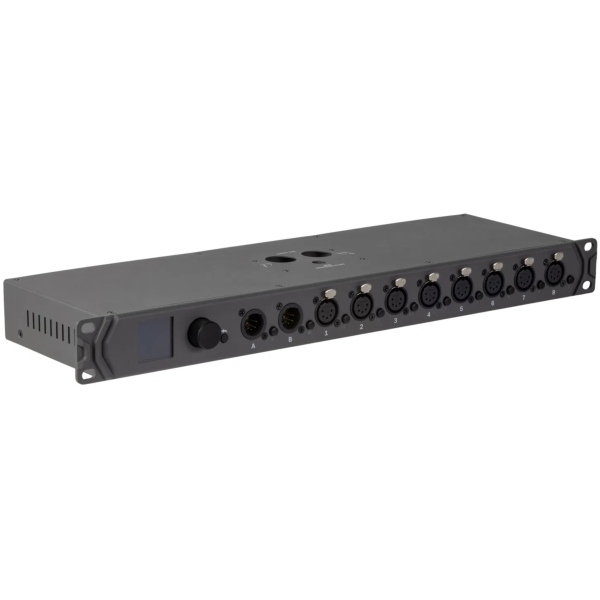 The SPLIT8PRO is a 8-way DMX distribution splitter/booster/merger featuring two inputs, passthroughs and 8 outputs electronically opto isolated from each other and from the inputs. Each output features a toggle switch to route either A or B input.