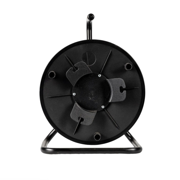 The elumen8 ER320 Empty Cable Reel offers increased capacity for storing and managing cables. Featuring a blank faceplate that can be drilled to accept connectors, it also includes an auxiliary winder for smaller leads. Constructed from strong materials with a steel frame and ergonomic handle, the CABL566 is designed for heavy-duty use in professional stage, touring, and industrial environments.