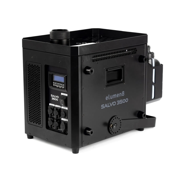 The elumen8 Salvo 3500 RGBA Vertical Fog Machine delivers high-output coloured fog bursts using 37 x 8W RGBA LEDs and a powerful 3000W heater, producing up to 117,000 cubic feet of fog per minute with a maximum reach of 15 metres. When used with Equinox CO2 emulation fluid, instant stop technology creates realistic CO2-style effects. Designed for versatility, it can be mounted vertically, horizontally, or overhead using the included omega clamps. Control is via a 4-button panel with timer, manual, and DMX modes, making the Salvo 3500 ideal for stage, club, and live event productions.