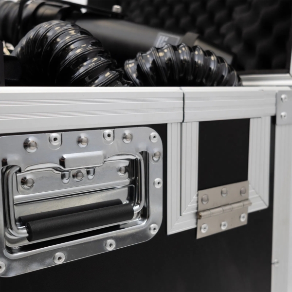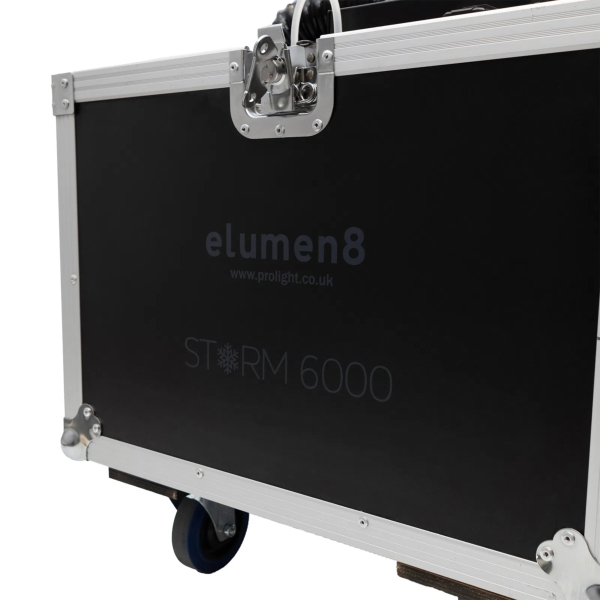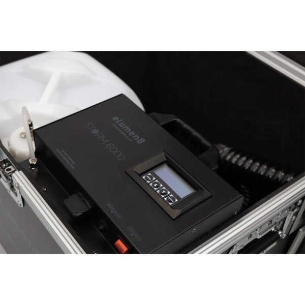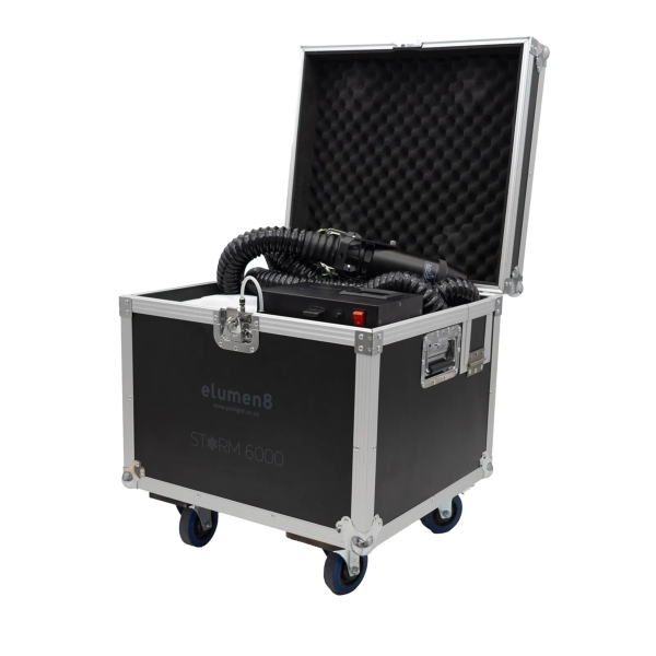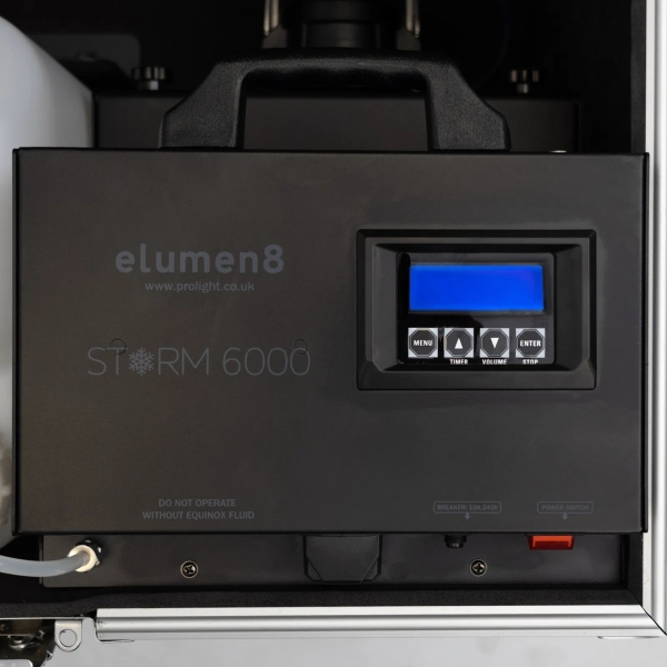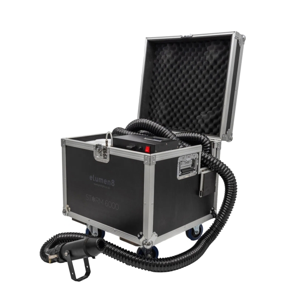 The elumen8 Storm 600 Snow Machine is a versatile, high-output snow machine designed for medium to large events. Its clever design allows the included flexible hose to be rigged while the main unit can be mounted or hidden behind scenery or under stages. It is supplied in a durable flight case with a 20L fluid tank, storage for accessories, and is fitted with rubber wheels. Control is via the on-board 4-button LCD display DMX or wireless remote for flexible operation.