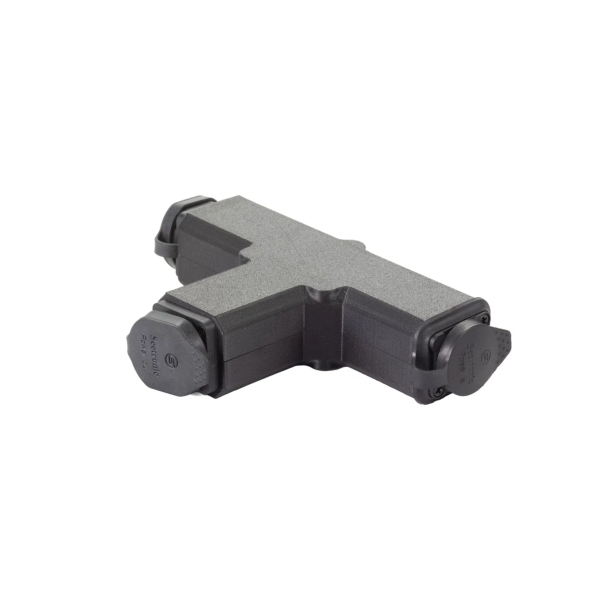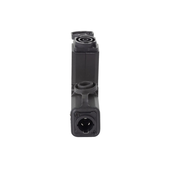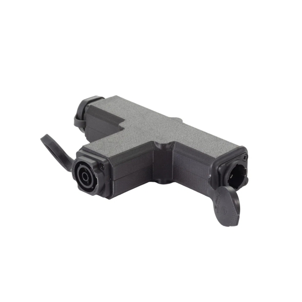 The elumen8 TR1-A Truelink T-Piece: 1 In 2 Out is a compact power splitter that divides one incoming power feed into two outgoing lines, allowing you to branch power safely and neatly in confined spaces. Designed for professional event and stage setups, it's built with a rugged black housing and IP44 protection against splashes and dust. Rated at 16A and 230V, the TR1-A provides reliable distribution for lighting and power equipment in demanding environments.