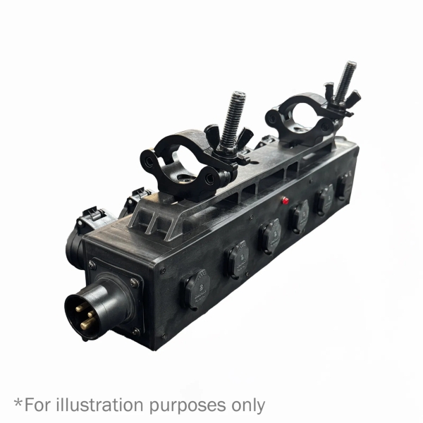 The elumen8 TR1-H TR1 Block with 6 Out is a heavy-duty, truss-mountable power splitter box designed for professional event and touring use. It provides six 16A PowerTwist TR1 outlets and six 16A CEE form sockets, along with 16A inlet and through-feed capability for daisy-chain power distribution. Operating at 230V, the TR1-H offers reliable, flexible connection across multiple fixtures. Built in a rugged rubber housing and fitted with two half couplers for easy truss mounting, the unit is rated IP54 for dust and splash protection - ideal for outdoor or damp environments where robust power delivery is essential.